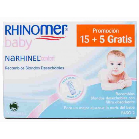 Narhinel Confort Recambios son recambios blandos desechables con filtros absorbentes indicados para el aspirador nasal para bebés de Narhinel.