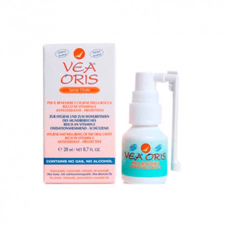 Vea Oris Spray Bucal 20 ml es un spray higienizante de tratamiento bucal. Su fórmula con vitamina E que reduce aftas, molestias bucales y llagas al mejorar la barrera protectora de la mucosa de la misma y preserva la mucosa frente a los agentes externos que la dañan. Fórmula sin aromas, agua, colorantes o alcohol.